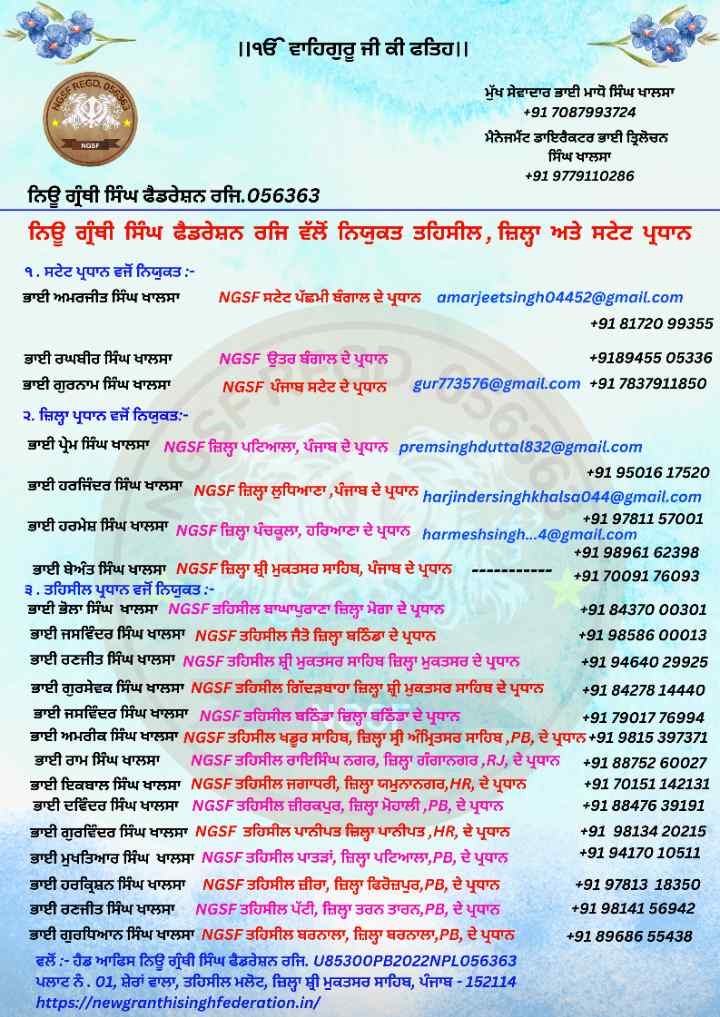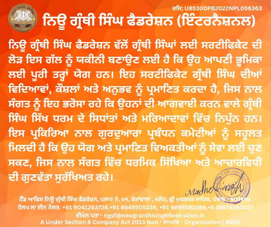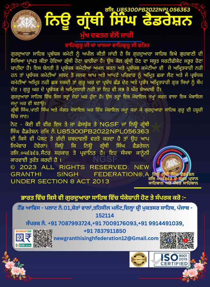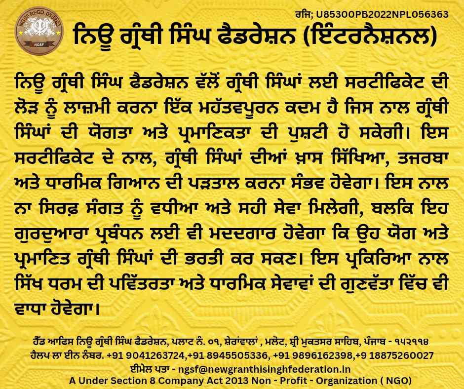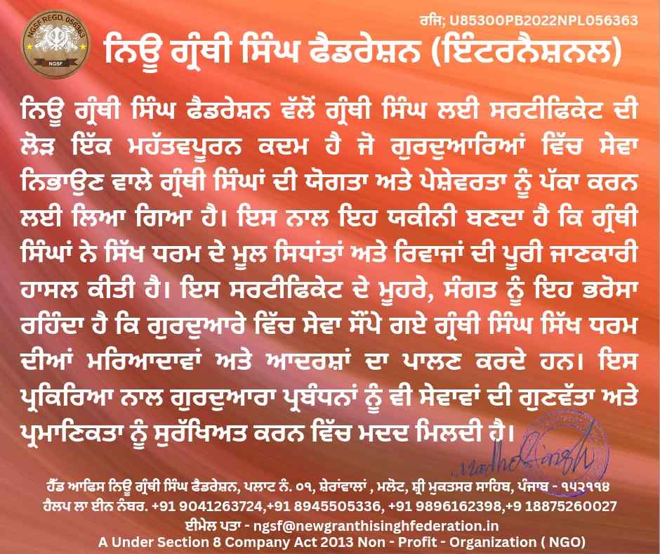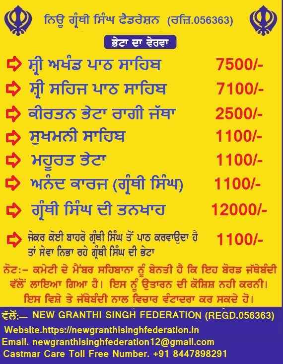 Contact No. +91 70879 93724 New Granthi Singh Federation Regd 056363
